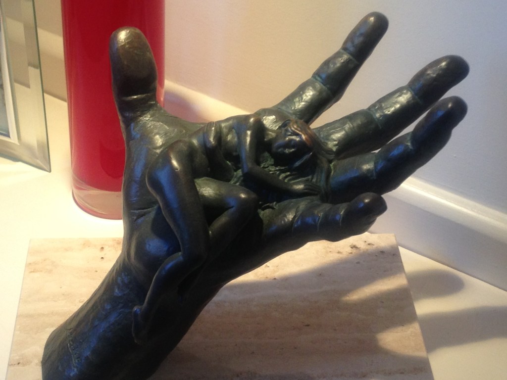 “When you’ve got no other option. And it’s time to tell the truth.” As I heard this lyric, I felt God remind me of the moment I was in the middle of a panic attack: body shaking, hyperventilating and throat constricted. I went into my bathroom and knelt by the toilet, and simply said to God, “This is me.” It was a moment of telling Him the truth. Of not trying to stop the attack, but surrendering to Him and accepting myself and the truth of who I was. As soon as I said that, my panic attack stopped. Not long after that, He completely delivered me, and for over 25 years I haven’t had another one. ‘Make It Out Alive’ really moved me. All the lyrics are powerful and will speak to the deep places in you that need healing, or know what it is to walk with God on difficult paths to come into your healing. I hope it moves you as it did me.God often speaks to the deep places of my heart through hands and this photo of my husband and son was no exception. ‘I am the Lord your God who takes hold of your right hand and says to you, do not fear; I will help you.’ Isaiah 41:13 No matter how ‘little’ we are inside, or in age, God is in the deep places of life with us. ‘Trust’ by Lorenzo Quinn – When I first saw this sculpture I loved it. It spoke to the deep places of my heart. Jon bought it for me a decade later, as a surprise, at a time when I was asking God if He cared about my heart. Jon didn’t know I was asking God this question.